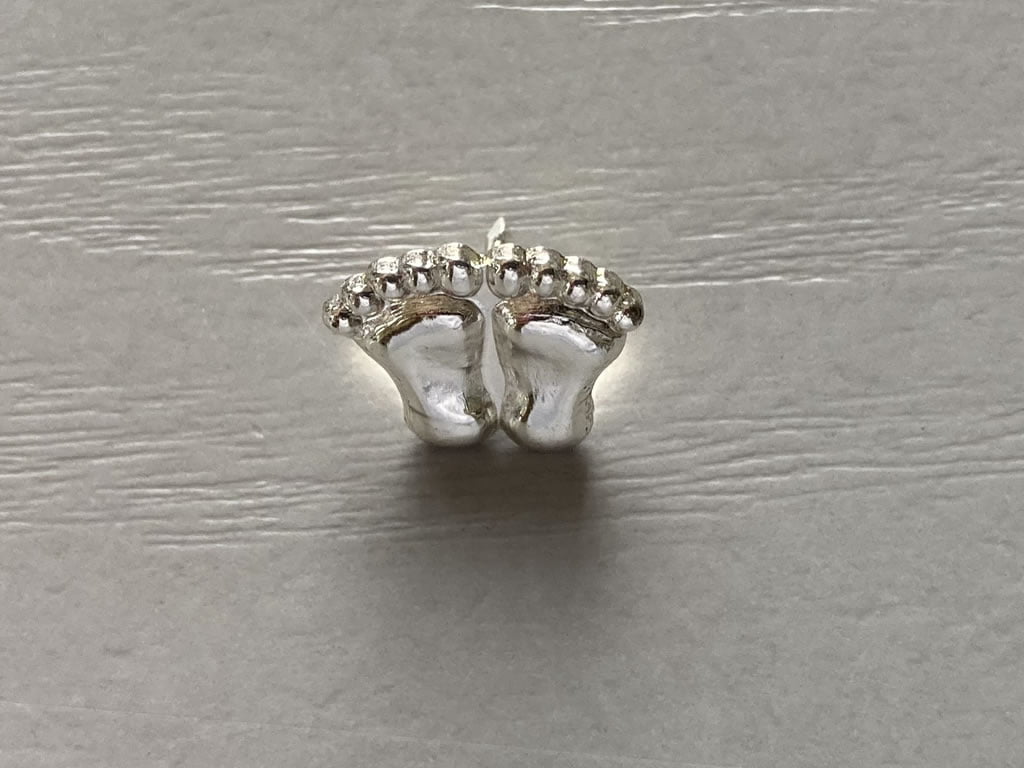 This tiny silver pin badge (approx. 10mm diameter) shows two feet is ideal for the reflexologist to pin to their overall.